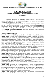 "Manuel Joaquim de Oliveira Faria Bolieiro, Presidente da Junta de Freguesia de Salvaterra de Magos e Foros de Salvaterra, do Município de Salvaterra de Magos: Torna público, nomeadamente tendo em atenção o preceituado no artº 21º, da Lei nº 75/2013, de 12 de Setembro, que no dia 04-05-2020, se realizará, pelas 18:00 horas, no Salão da Sede da Junta de Freguesia de Salvaterra de Magos e Foros de Salvaterra, em Rua Timor LoroSae, nº2 – 2120-100 Salvaterra de Magos, a reunião Ordinária, com a seguinte